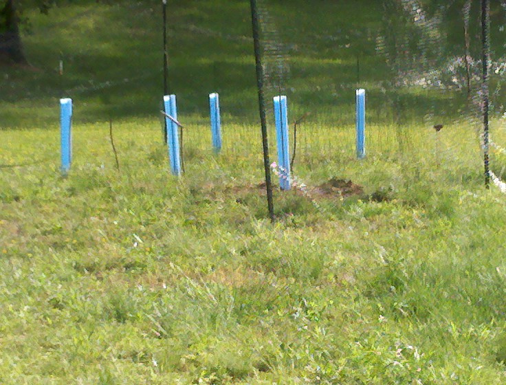 At long last — actually, it was only two weeks — the Cab Franc vines emerged from the soil. When we planted the vines, the graft union — the large swollen area where the root stock and the scion met — was hilled over, which is to say, we made a mound of dirt to cover the graft union. The graft union very quickly sent shoots up, and so this weekend, we removed the dirt that we had mounded over the vine, sprayed for all the diseases that Virginia humidity and (especially) rain can bring, and then place the blue-x grow tubes over the vines.