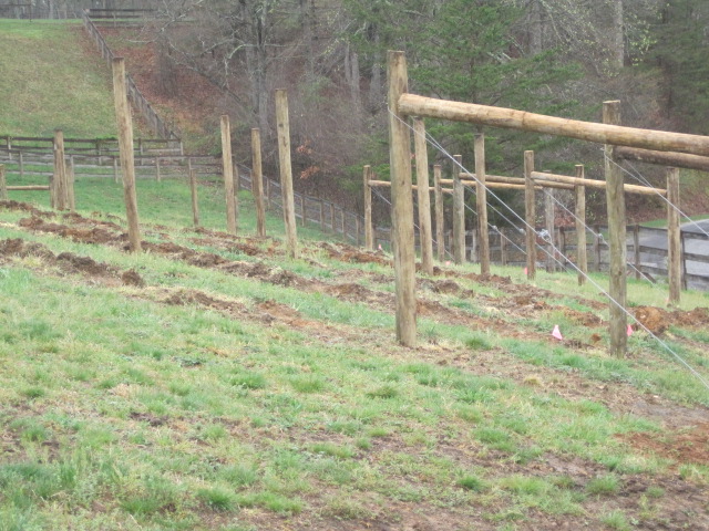 Continuing on the plus side, we hired a contractor to get posts in the ground for the trellises and the H-brace end-post system. I had wanted to do that work myself (which is to say, I wanted so badly to buy the auger and bits for my tractor), but with spinal surgery pending in May, I had to contract the work out. Later in the spring, I was at least able to run the bottom wire myself, and that was both fun and satisfying.